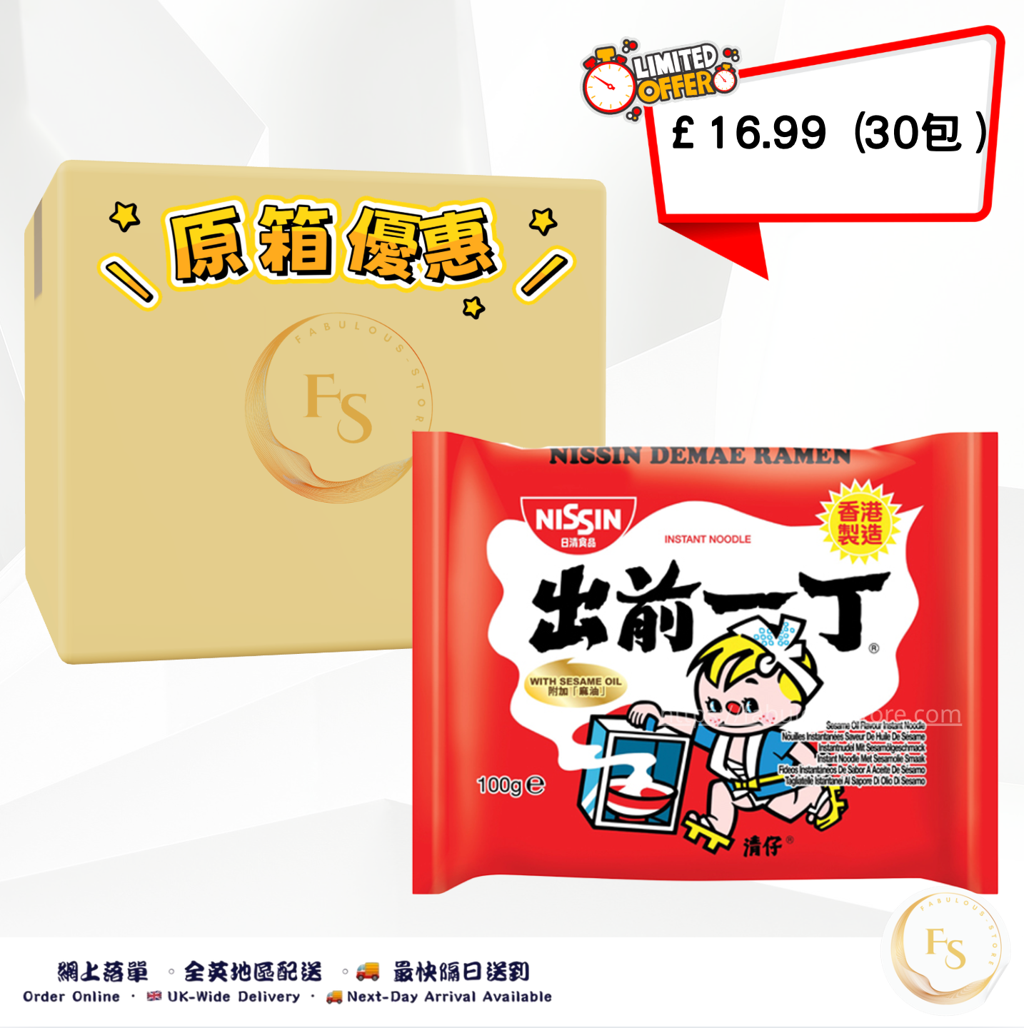 香港 出前一丁 ( 麻油味 ) - 100g x 30包 (原箱優惠 )(賞味期 :Apr - May 2026 )