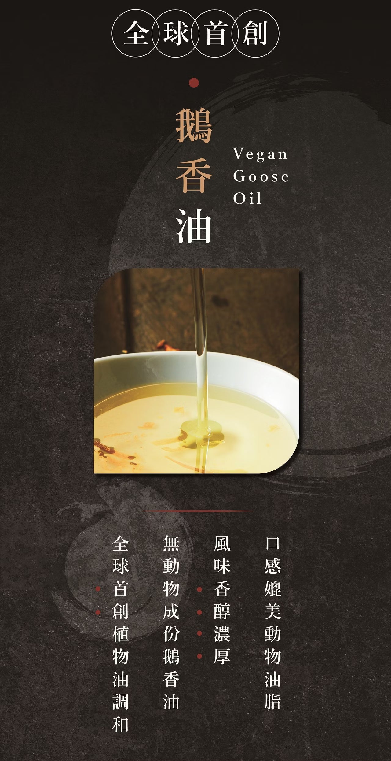 A groundbreaking creation using 100% plant-based oils to recreate the rich aroma of goose oil — without any animal ingredients.